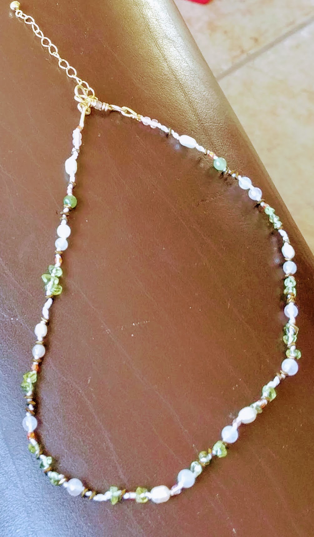 For a student of mine; I made this peridot and pearl necklace for her, small and delicate.