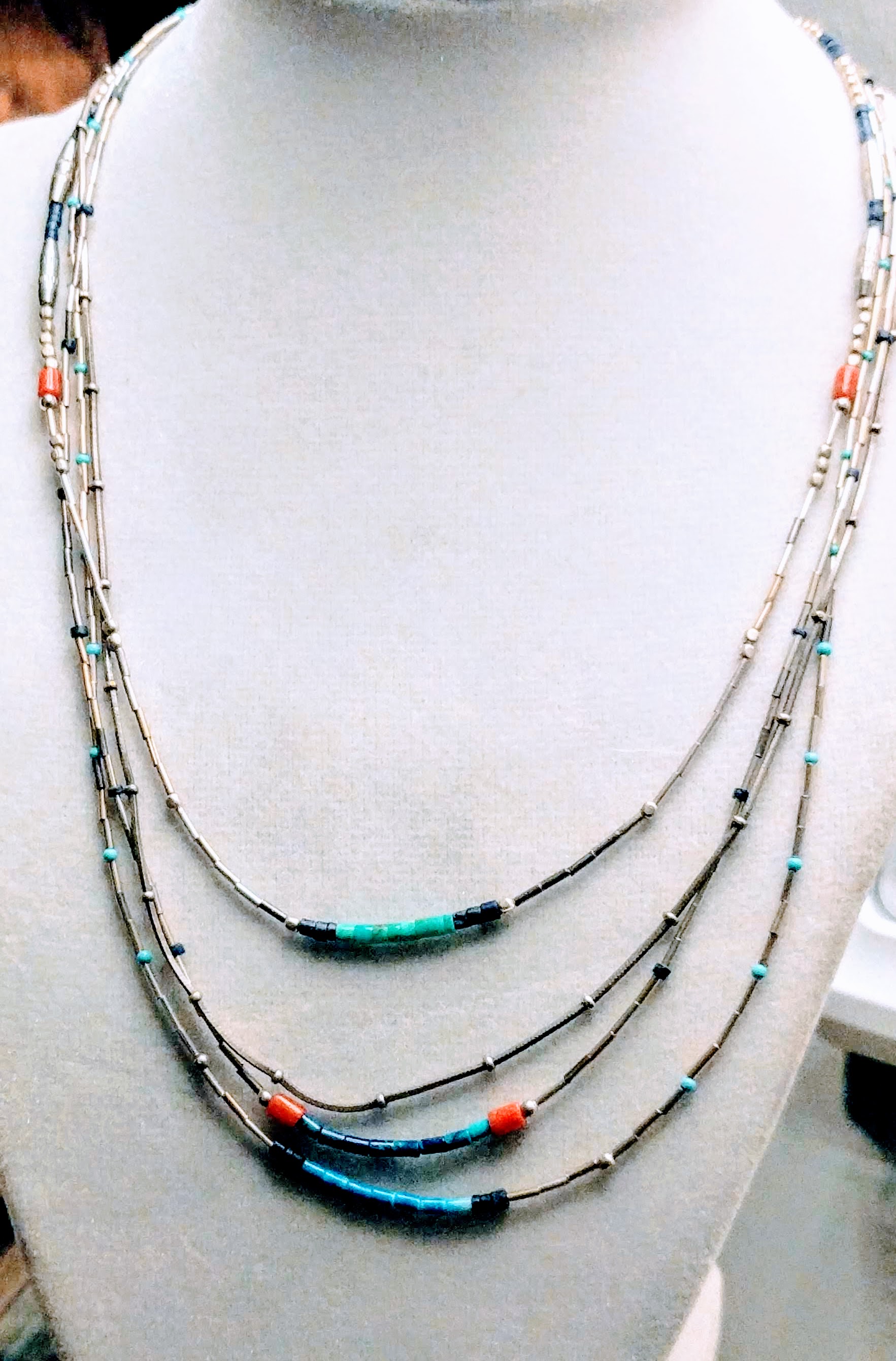 I styled three silver and stone necklaces into one.